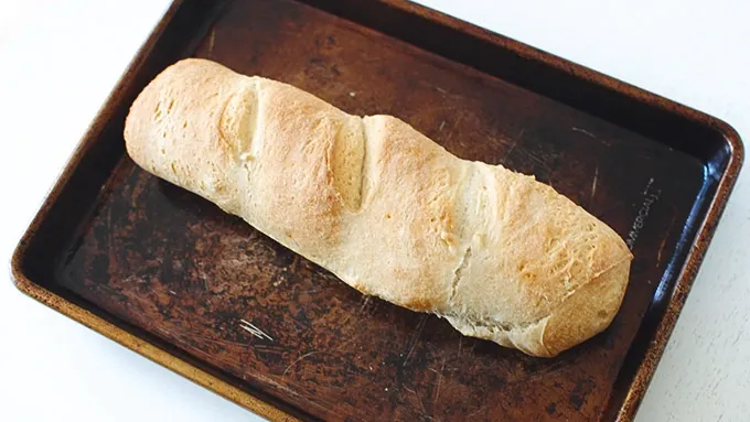 Step1Preheat oven to 350°F. Place the bread dough on a greased baking sheet, seam side down, and bake for 23 to 28 minutes.