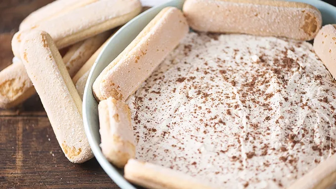 Step4Carefully spread 1/2-inch layer of cream cheese mixture on top of the soaked ladyfingers. Sprinkle with 1/4 cup cocoa powder.