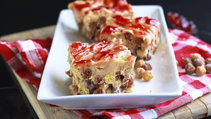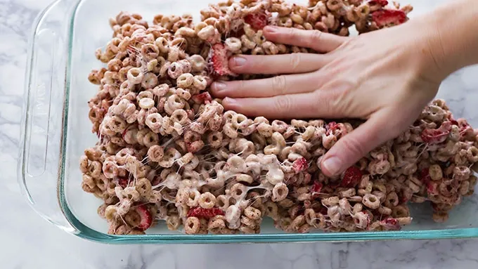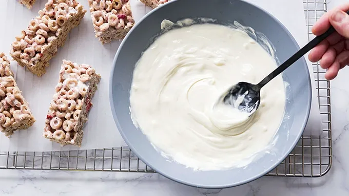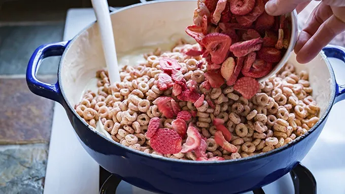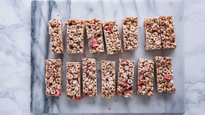 - What happens when you take the classic milk-and-cereal combo, and turn it into a tasty krispy bar? These Berries and Cream Cereal Bars come out of your kitchen, and all the world is berry beautiful. (And tasty, too!) You start this recipe as you would with any krispy bar, melting together butter and marshmallows. But this is where we divert from the traditional. Instead of crispy rice cereal, freckled pink Very Berry Cheerios™ are stirred in. And a pouch of tangy freeze-dried strawberries. But that’s not all! Once dry, the bars are dipped in a Greek yogurt icing, just to finish off that strawberries and cream combo. And it’s a winner! If you’re craving something crunchy and sweet, but a bit different from the plain old, grab a box of Very Berry Cheerios™ and get your crispy on. You’ll be berry glad you did.