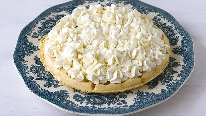 Step4In a large bowl or stand mixer, beat whipping cream until soft peaks form. Add mascarpone. Whip again until stiff peaks form. Transfer to a piping bag fitted with a large star tip. Pipe mascarpone cheese on top of waffle. Top with berries.