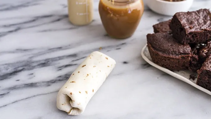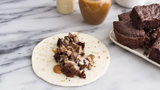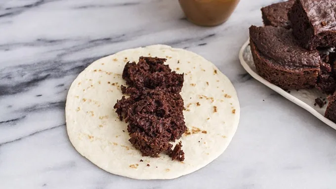 Step1Lay the tortillas on a clean work surface. Crumble 1/3 of the chocolate cake down the center of the tortillas, dividing equally between them.