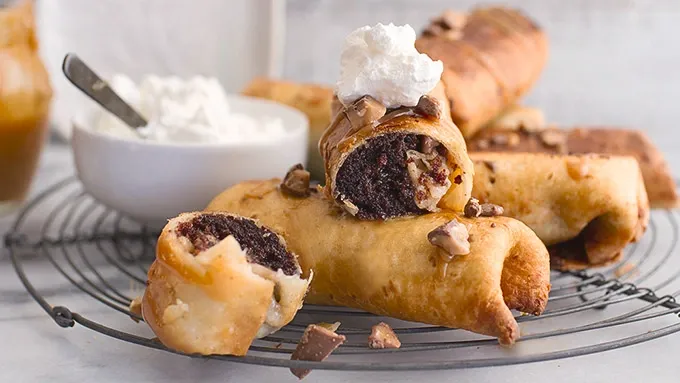 - Chocolate cake, caramel and toffee bits... inside deep-fried chimi tortillas. What?! These mini chimis are perfect game-day party food. They're handheld, insanely delicious and worthy of every touchdown... whether for your team or not. Yes, these are that good. And they're cute too! Who could resist? Tell your guests what the recipe name is and, well, they'll be good as gone. So the idea behind these is a lot like better than sex cake. We're just rolling all those over-the-top flavors into tortilla shells – chocolate cake, sweetened condensed milk, caramel sauce and toffee chunks – and then frying them up. Drizzle the warm, fried chimis with more caramel if you want, and serve right away with a side of whipped cream. There can't be a better combo – a great game and BTS dessert!