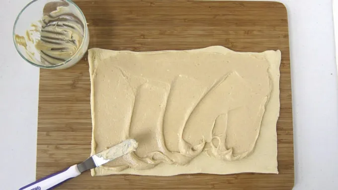 Step3Beat cream cheese, marshmallow fluff and peanut butter until fluffy. Spread over crescent dough. Sprinkle 3/4 cup mini chocolate chips and 2 tablespoons toffee bits over peanut butter filling.