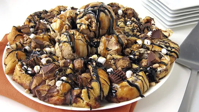 - Dig into this dessert with passion and enthusiasm. It's worth it! When you scoop up one of these crescent rolls wrapped around peanut butter cheesecake mousse, chocolate chips, toffee bits, and a big marshmallow. With each bite you'll find decadent hot fudge sauce, caramel sauce, and even peanut butter cups. Decadent? Yes, indeed! To put this dessert over the top, add big scoops of your favorite ice cream in the center of the ring before serving. Your loved ones will thank you for it. Admire that ooey gooey deliciousness. Doesn't it look indulgent?