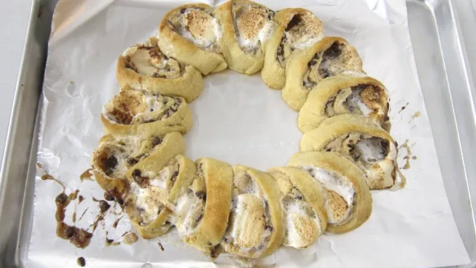 Step6Bake for 15-18 minutes, rotating the pan midway through baking cycle, until the crescent dough turns golden brown and marshmallows are melted and toasted. Remove and allow to cool slightly.