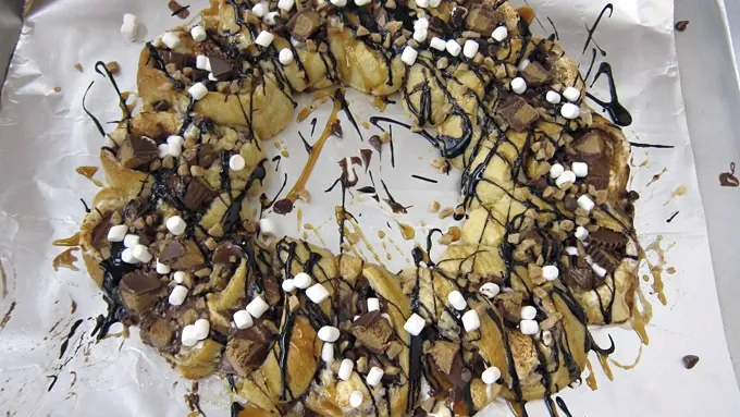 Crescent roll pinwheels stuffed with peanut butter cheesecake filling, chocolate chips, peanut butter cups, toffee bits, and marshmallows and drizzled with hot fudge and caramel sauce.