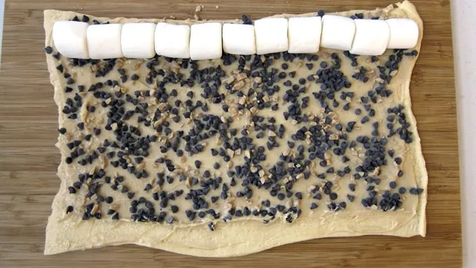 Step4Line up 10-12 marshmallows along one long edge of the dough. Roll up dough around the marshmallows. Continue to roll into a long log. Freeze for 20 minutes.