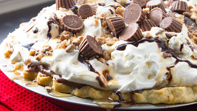 Step7Spoon whipped topping over the caramel sauce. Use a spatula to create decorative peaks. Drizzle extra hot fudge sauce and caramel sauce on top. Sprinkle with toffee bits and peanut butter cups. Place pie in freezer for 30-60 minutes to set it up quickly before serving. Enjoy!