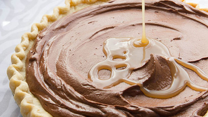 Step6Drizzle caramel over the chocolate mixture, reserving 2 tablespoons of the caramel sauce for drizzling on top of the pie.