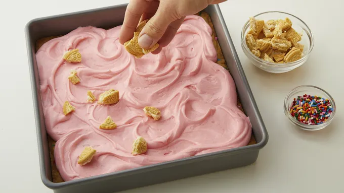 Hey shorty, if it’s your birthday, or if you want to party like it’s your birthday, might we suggest you do it with sprinkles and crumbled Oreo cookies? We took our favorite pudding-based cookie bar recipe and topped it with pretty, pink from-scratch frosting to make this bright and colorful bar a special treat.