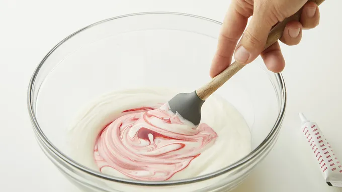 Step4In large bowl, beat 1/4 cup softened butter, the powdered sugar, vanilla and 2 tablespoons of the milk with electric mixer on medium speed until smooth and creamy. If frosting is too stiff to spread, add additional milk, 1 teaspoon at a time. Tint with red food color to desired pink color.