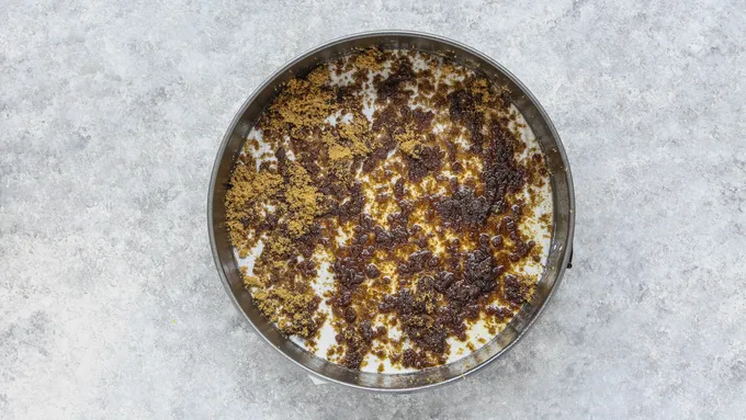 Step2Melt butter and pour into the bottom of the cake pan. Sprinkle brown sugar evenly over butter.