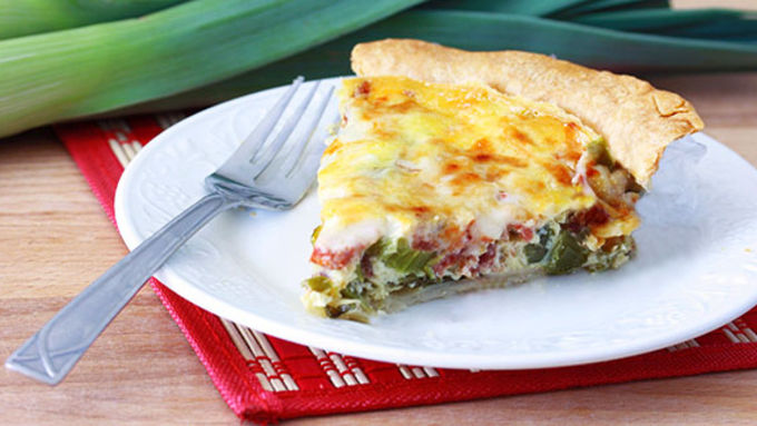 Salty bacon, buttery leek and fire-roasted tomatoes, topped off with savory cheese...this is one finger-lickin' quiche!