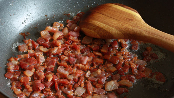 Step2Fry the bacon in a skillet until crispy. Set aside.