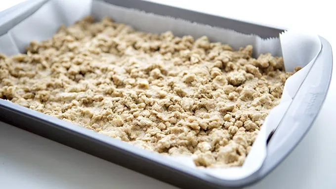 Preheat oven to 350°F. In a large bowl or stand mixer, beat together flour, butter, egg, lemon zest, brown sugar and vanilla until smooth. Add granola and mix well. Press 3/4 of the mixture into the bottom of a 9 x 13 parchment-lined baking dish.