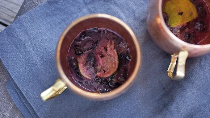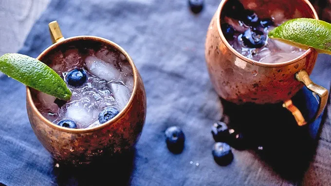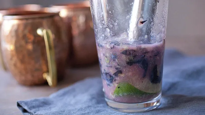 Step2Transfer blueberry mixture to a copper mug and add crushed ice.