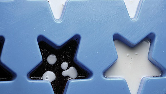 Step4Using a funnel or eye dropper fill the star mold a little over a 1/3 of the way full. The red and blue colors will be more than the white...just like in a bomb pop.