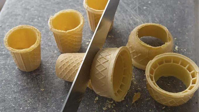 Step2With a very sharp, non-serrated knife, slice the top off of each ice cream cone. Discard the tops, set the bottom cup portions aside.