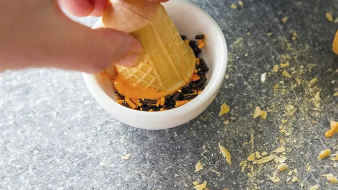 Step4Drizzle a spoonful of candy melt into the center of the cone. Swirl it around, ensuring the inside of the entire cone is fully coated with candy melt. Tip cone upside-down to allow excess candy melt to drizzle out.