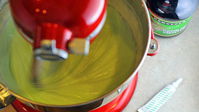 Step7Divide the batter in half. Add a few drops of green food coloring to the one batter and stir until fully incorporated.