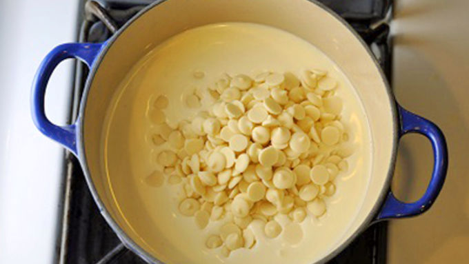 Step4Bring 1/2 cup cream to a simmer in a small saucepan. Remove from heat, and add white chocolate, stirring until smooth. Stir in the gelatin mixture, and allow to cool.