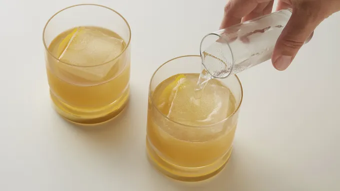 Step2For each serving, mix bourbon and 1 1/2 oz honey syrup in a double old-fashioned glass or 12-oz tumbler. Fill with ice, and top with club soda.