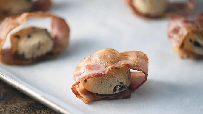 Step4Wrap 1 slice of bacon around each ball of dough, leaving space on the edges for the cookie to expand as it bakes.