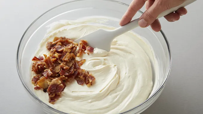 Step1Brown Sugar Bourbon Bacon: Preheat oven to 350°F. Line baking sheet with non-stick tin foil or parchment paper. Lay strips of bacon on lined baking sheet. Use a pastry brush to brush bourbon over slices of bacon, then sprinkle brown sugar evenly over each slice. Bake for 25-30 minutes, until bacon is evenly cooked and crispy. Remove from pan, set on a paper towel, and allow to cool for 10 minutes. Finely chop bacon once cooled.