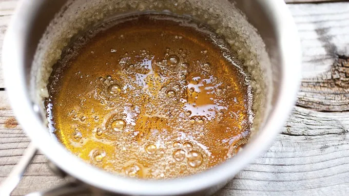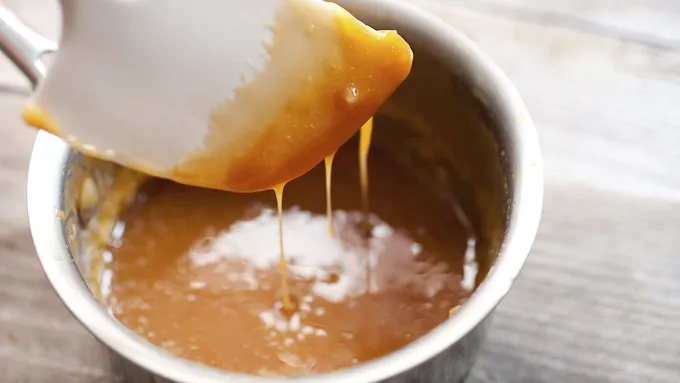 Step5Cook caramel, swirling occasionally, until mixture is bubbling and the sauce turns a medium tan color, about 15 minutes.