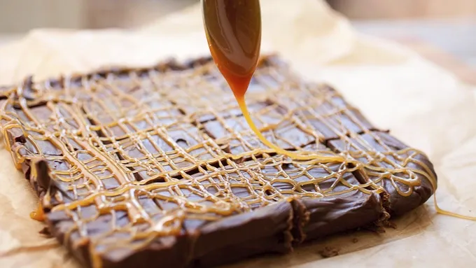 Step7When fudge is chilled, remove it from the baking sheet and peel off parchment paper. Then chop fudge into 16 even pieces and drizzle heavily with bourbon caramel. Sprinkle fudge with flaky sea salt. Try not to eat it all at once!