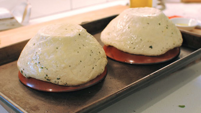 Step4Turn two oven-safe bowls upside down and lightly grease the bottoms and sides. (Cooking spray or oil is fine.) Lay the dough over each bowl and manipulate it so it's even and snug on the bowls. Lightly brush with oil. Place the two bowls on a baking sheet and slide into the oven for about 20 minutes, or until golden brown.