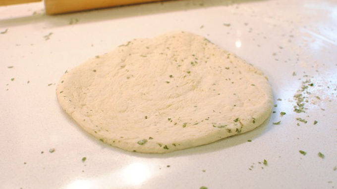Step3Pull the bread from the tube and roll it into a ball. Add the herbs and garlic salt; knead well to mix everything together. Using a pastry cutter, divide the ball in half. Roll out the smaller balls into 8-inch circles (roughly).