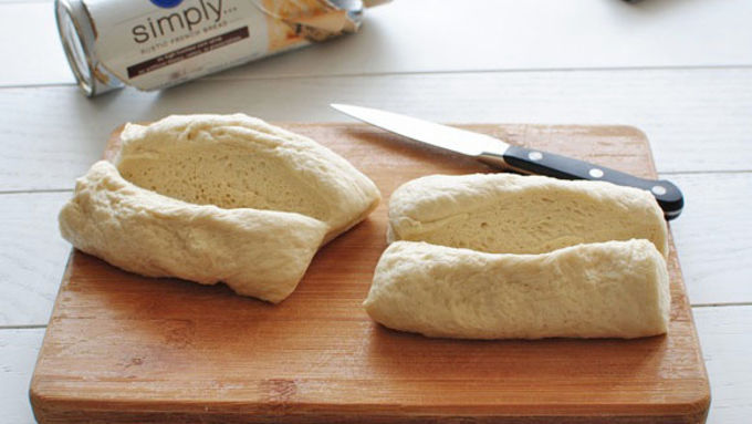 Step1Preheat oven to 350°F. Roll the French bread out onto a lightly floured work surface. Using a pastry cutter, divide the loaf in half. Using a paring knife, cut a deep slit down the center of each loaf half, creating a hoagie.