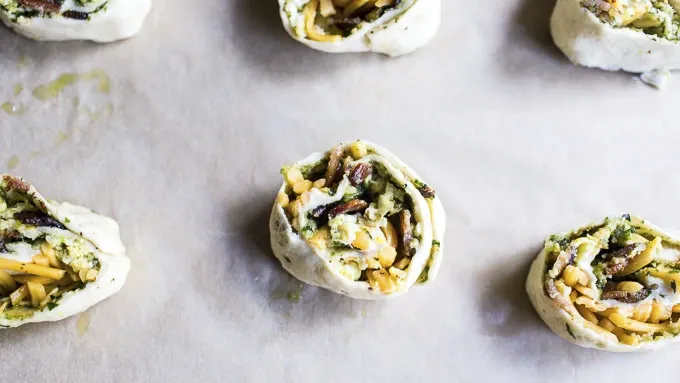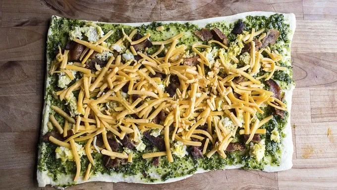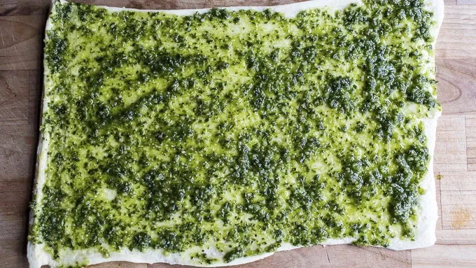Unroll the crescent dough onto a lightly-floured cutting board. Spread the pesto over the dough, leaving a 1/4-inch border around the edges.