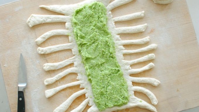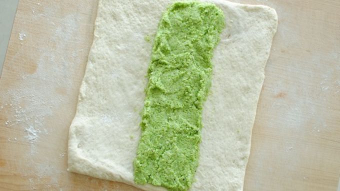 Step3Roll the loaf out into a square on a floured surface. Spoon the broccoli pesto down the center of the square.