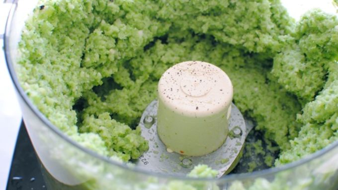 Step2In a food processor, combine the broccoli, almonds, garlic, cheese, salt and pepper. With the motor running, add the oil in a thin stream, until you get a pesto consistency. Taste and add more salt if needed.