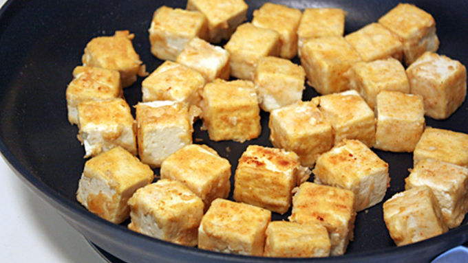 Step1Preheat oven to 350°F. Toss tofu in a large bowl with flour and salt. Heat vegetable oil in a large skillet. Shake off excess flour from tofu and place in a single layer in hot skillet. Saute until golden brown.