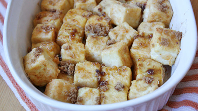 Baked tofu sweetened with a brown sugar and orange glaze.
