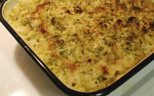 Creamy mac and cheese with a crust of browned brussel sprouts!
