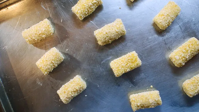 Step3Cut each cheese stick into 3 equal nugget-sized pieces. Put the flour and breadcrumbs onto plates. Whisk the eggs and put them onto a third plate. One by one, coat the cheese in the flour, then the eggs, then back to the flour, then egg again, and then finally the breadcrumbs. Really press the breadcrumbs onto the cheese. Repeat the process until all the pieces of cheese are coated.