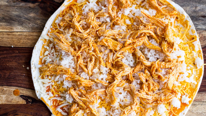 Step2Heat an electric griddle or skillet over medium heat. Add a bit of olive oil. Lay a tortilla flat on a cutting board and cover with 1 to 2 tablespoons Buffalo sauce. Sprinkle on a bit of the cheddar cheese, then evenly distribute the rice and chicken over the top. Sprinkle with a bit more cheese and another drizzle of Buffalo sauce. Add the top tortilla. Repeat with the remaining tortillas.