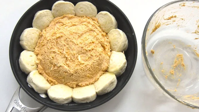 Step4Spoon the dip in the center of the skillet, spreading it out to the edge of the dough slices.![]()