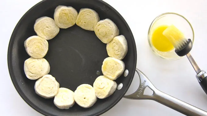 Step2Brush the inside of a 10-inch non-stick skillet with about a teaspoon of melted butter. Arrange the slices of bread dough around the outer edge of the skillet, making sure they are evenly spaced around the edge of the pan. Brush dough with about half of the remaining butter.![]()