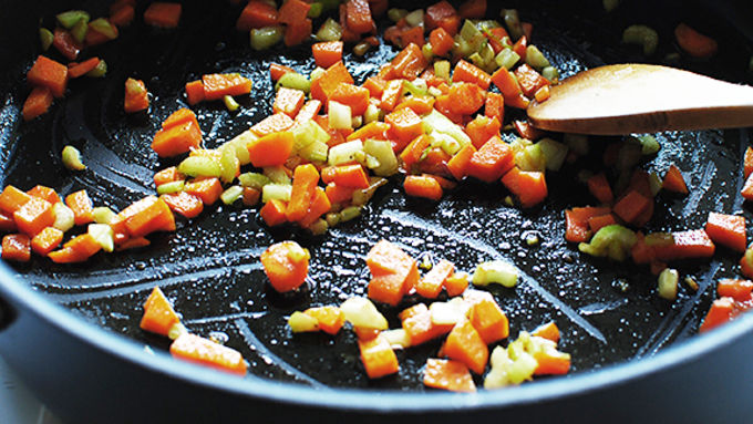 Step2While the sweet potatoes cook, render your bacon until crispy. Set aside to drain on paper towels. Crumble. Drain all but a tablespoon of the fat and add the carrots and celery. Sauté until they start to soften, 5 minutes.