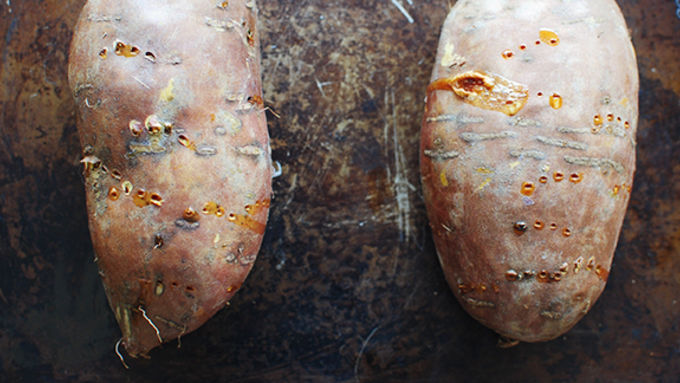 Step1Preheat the oven to 400°F. Pierce the sweet potatoes with a fork and roast them on a baking sheet for about an hour. Longer if needed. Let cool.