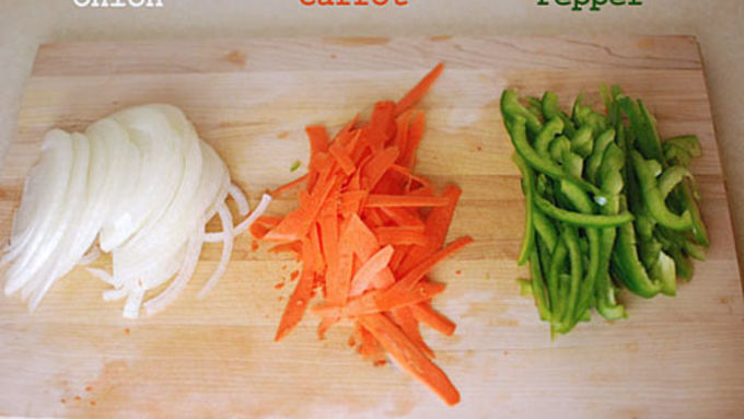 Step2Thinly slice the pepper, onion, and carrot.