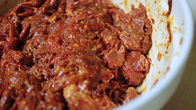 Step1Make a paste from the garlic and ginger using a microplane or food processor. Mix the garlic, ginger, pepper flakes, brown sugar, gochujang, rice wine vinegar, soy sauce, and sesame oil to make the bulgogi marinade. Add the shaved beef and let it sit for an hour.