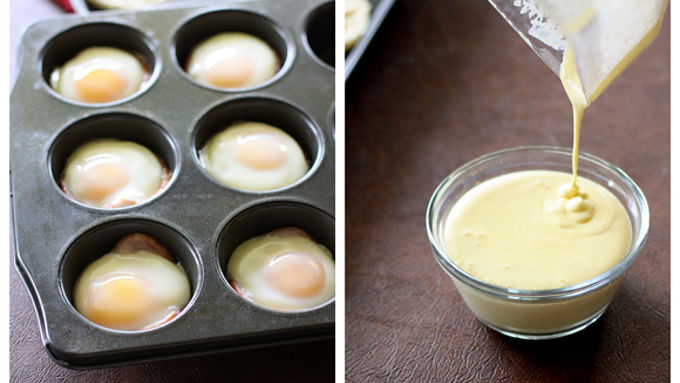 Step5Once eggs are done, pop them out with a spoon and place on top of a toasted muffin. Spoon Hollandaise sauce over each egg and serve.