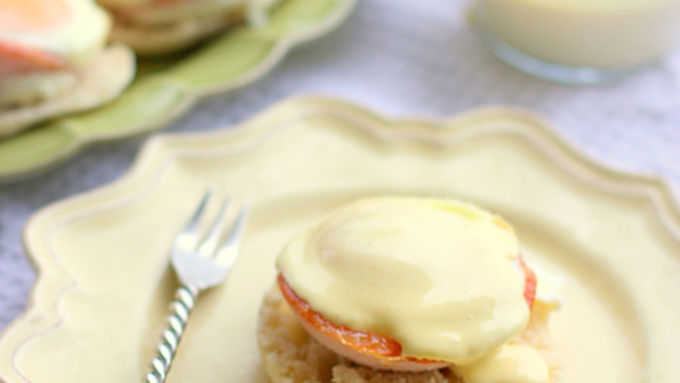 - Super easy Eggs Benedict? Believe it! You can do this -- and it's super pretty, too! Eggs Benedict is one of those dishes that I would order at a restaurant but not necessarily make at home. It seems like it would be way too time consuming. Poaching eggs and making Hollandaise sauce is more effort than I’m usually up for in the morning. So I came up with some shortcuts to make this dish extra easy and unbelievably quick. This simple Canadian Bacon-Cup Benedict has amazing flavor with half the work. Traditional Eggs Benedict calls for poached eggs. To be honest with you, I've never poached an egg in my life and I don't plan on starting now. Baking eggs in muffin tins is a trick I've used before. It makes for perfect eggs without hovering over a stove. I placed a slice of Canadian bacon in the bottom of each muffin tin, so not only did I have an egg "holder" but it heated up my bacon at the same time. The Hollandaise sauce for this recipe is very easy. Usually it requires whipping and beating on the stove top, but this sauce is made all in the blender. Pushing a button on the blender is as strenuous as it gets here, people. Hot butter and egg yolks are beaten into submission resulting in a creamy, heavenly sauce. Seriously, I almost started pouring it over everything in hand's reach. And just when you've finished your sauce, your eggs should be finished! Stick this one in your tried-and-true file because this one's a keeper! Check out the rest of our easy egg recipes for breezy mornings!