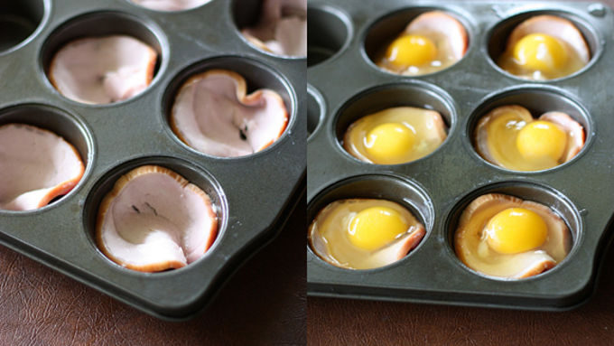 Step1Preheat oven to 350°F. Spray a muffin tin with cooking spray. Press 1 slice of Canadian bacon into each muffin tin. It's okay if it breaks a little; it doesn't matter in the end.